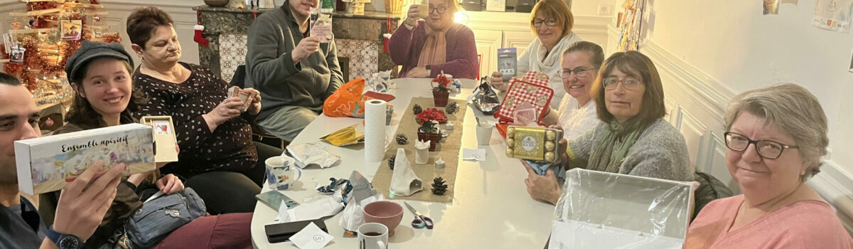 À deux jours du réveillon, nous nous retrouvons au local pour partager un moment convivial et chaleureux. Chaque adhérent a prévu un petit cadeau qui sera tiré au sort par un ami du GEM et inversement. Chacun est donc reparti avec un joli présent soigneusement choisi par un membre de l’Émeraude.
