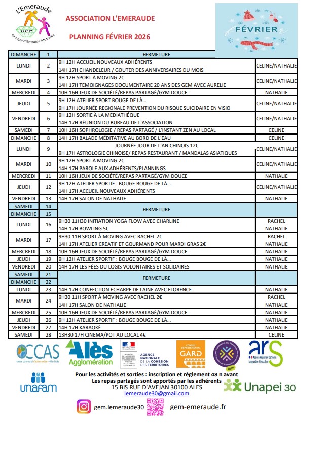 Planning du mois de Février