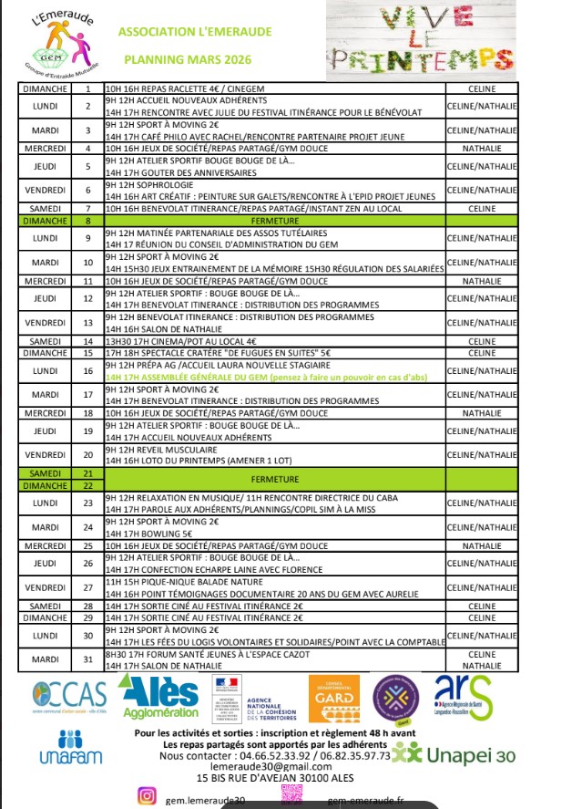 Planning du mois de Mars